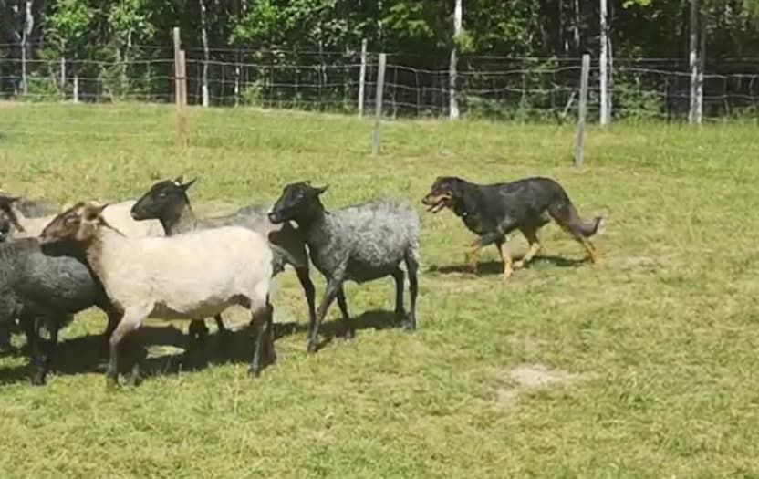 Partie 1: Calme, attentif et curieux. Coopératif et obéissant. Partie 2: Intérêt persistant autour de l'ourlet et vers le haut. Équilibres et récupère les moutons avec le propriétaire en dehors du pli. Agréable chien développable. PHOTO: Nessi en travail au troupeaux.